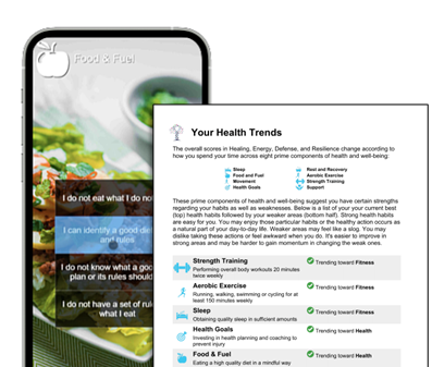 The Health Inventory is an online thinking tool to help you gain the clarity you need to feel vibrant every day. Just like an inventory found in a warehouse or retail store, the Health Inventory is a complete list of everyday habits that have been proven to contribute to resilience. When you take the Health Inventory, you answer a sequence of questions spanning eight components of health and well-being. Taking the Health Inventory can help you begin a process of self discovery and awareness.